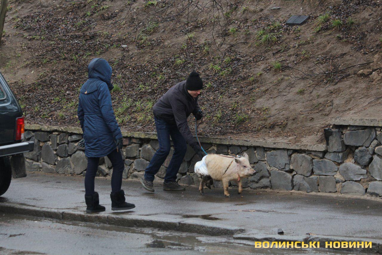 Так, кабанчик у підгузнику голосно кричав та опирався, привертаючи увагу перехожих.