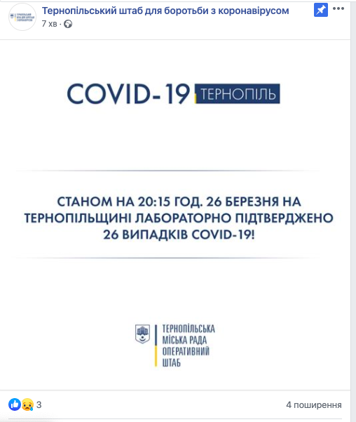 Але вже за 15 хвилин з'явилася інформація про те, що кількість заражених зросла до 26 осіб.21 хворий СОVID-19 – в Монастириському районі, 1 – летальний.