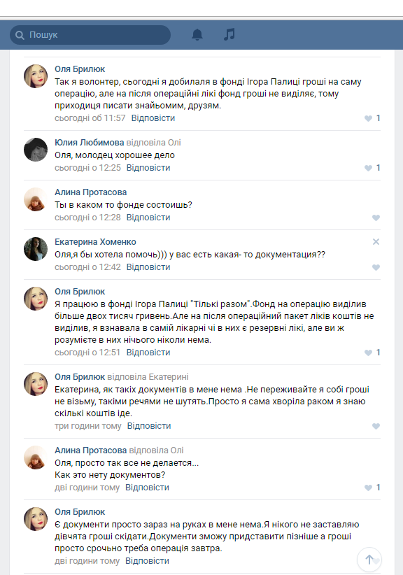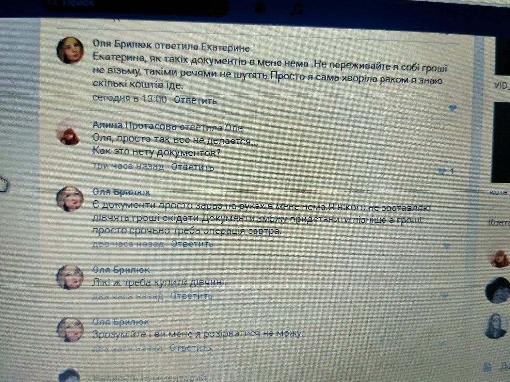 Ольга Богдан (у соцмережі Ольга Брилюк) розгорнула «діяльність» у закритій групі «Девичьи секреты». Як з’ясувалося, чимало небайдужих громадян виявили бажання допомогти хворій дівчині. Щоправда, ані прізвища хворої, ані документів Ольга Брилюк не надавала, посилаючись на зайнятість – мовляв, «не розірвуся».