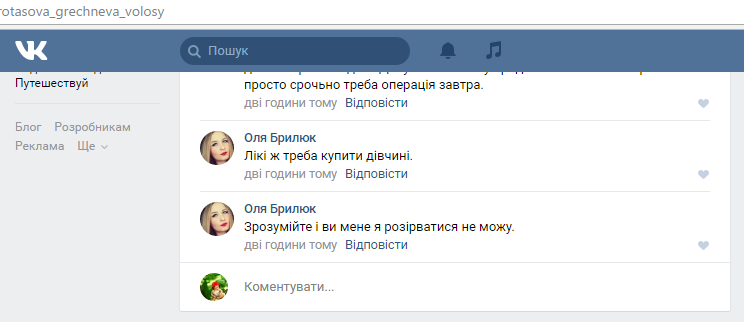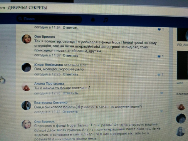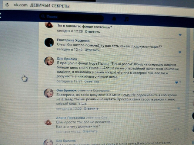Після того, як на сторінці групи «Девичьи секреты» у соцмережі з'явилися застереження щодо достовірності інформації, наданою Ольгою Брилюк, ця особа видалила всю переписку на цю тему. Однак учасниці спільноти, які вели з нею розмову, надали ІА Волинські Новини скріншоти переписки, які публікуємо нижче.