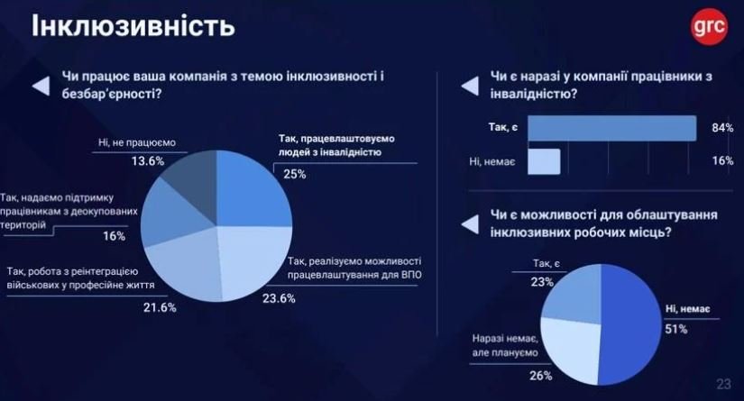 Дослідження засвідчило, що порівняно з 2023 роком зросла кількість компаній, які працевлаштовують людей з інвалідністю – з 36% торік до 50% нинішнього року. Водночас збільшилася кількість роботодавців, які беруть на роботу ВПО – з 35% у 2023 році до 47% у 2024 році.