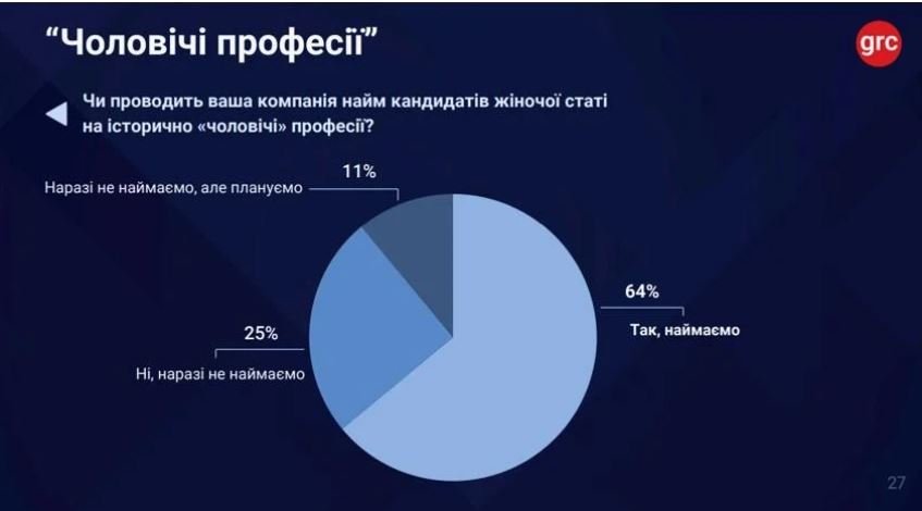Крім того, дедалі частіше українські організації наймають жінок на посади, які раніше обіймали фахівці-чоловіки. Переважна більшість, а це 64%, компаній озвучила, що наймають кандидаток на такі посади. Ще 11% планують наймати жінок, але 25% компаній не готові йти на такий крок.Українські компанії одностайно висловлюють думку, що для роботи їм потрібна підтримка держави:
