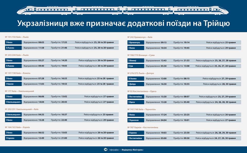 Всього на пікові дати з 25 по 29 травня компанія призначила 15 додаткових поїздів в найбільш популярних напрямках. Про це повідомляє прес-служба Укрзалізниці.