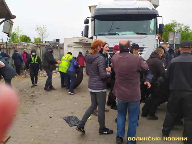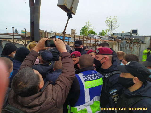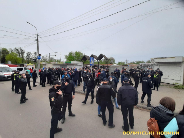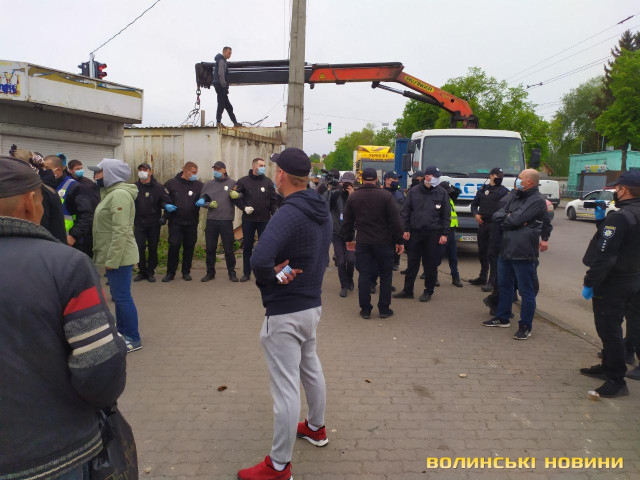 Під час засідання виконкому 15 травня було прийняте рішення про примусовий демонтаж, його забезпечують працівники департаменту муніципальної варти Луцької міської ради.За станом на 16:50 базарники почали провокувати конфлікт, намагаються перешкоджати демонтажним роботам. Муніципали і поліція утворили живий кордон, аби базарники не прорвались до осіб, які демонтують контейнери.Один із підпримців, аби завадити демонтажу, виліз на дах контейнера з каністрою води та погрожує обливати всіх.Базарники не дозволяють, аби муніципали мирно демонтували та вивезли контейнери. Мовляв, їх про це не попередили. Та обіцяють, що нібито вивезуть самі, й зроблять це до 20 травня.Працівники муніципальної варти намагаються зрізати секції паркану, аби дістатися до споруд, що підлягають знесенню. Проте підприємці намагаються їм завадити, вони провокують працівників поліції, імітуючи бійку, та навмисне кричать.Один із протестувальників за кермом Жигуля заблокував евакуатор. Муніципали намагалися відкотити його на дорогу, аби звільнити шлях евакуатору. Базарники намагалися завадити та накинулися з кулаками на працівників муніципальної варти та поліцейських.Натомість водій Жигуля, який був у салоні за кермом, поїхав на людей, поліцейських, муніципалів та журналістів. Його дістали з авто та забрали спецпризначенці.