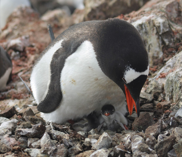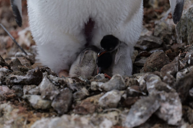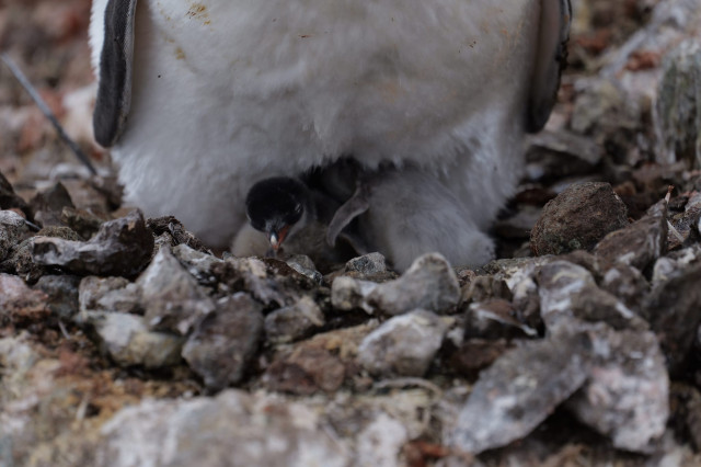 Перше дитинча вже активне – годується, пищить, тож йому десь пів доби. А друге, імовірно, вилупилося лише перед приходом науковця, бо було ще в шматках шкаралупи й ховалося під дорослого пінгвіна.