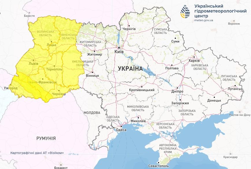 I рівень небезпечності, жовтий, оголошено у таких областях:
