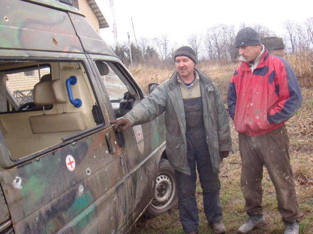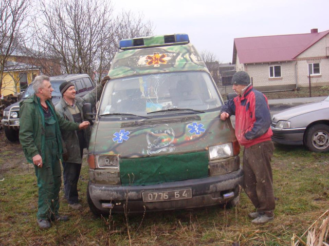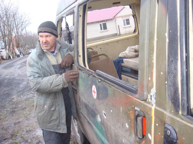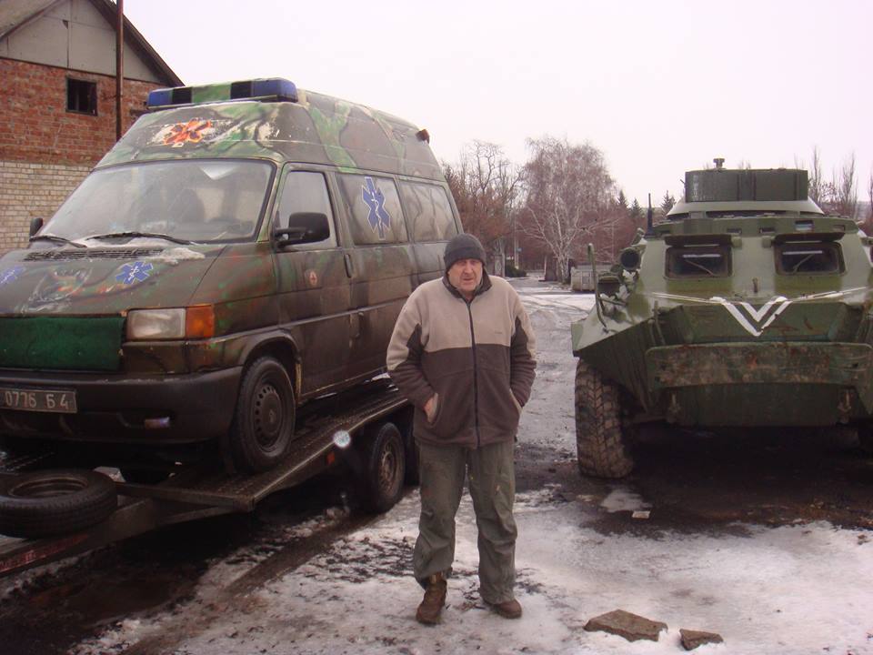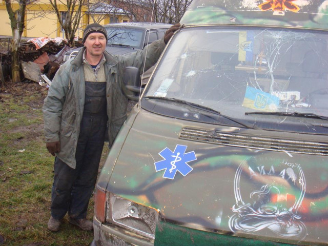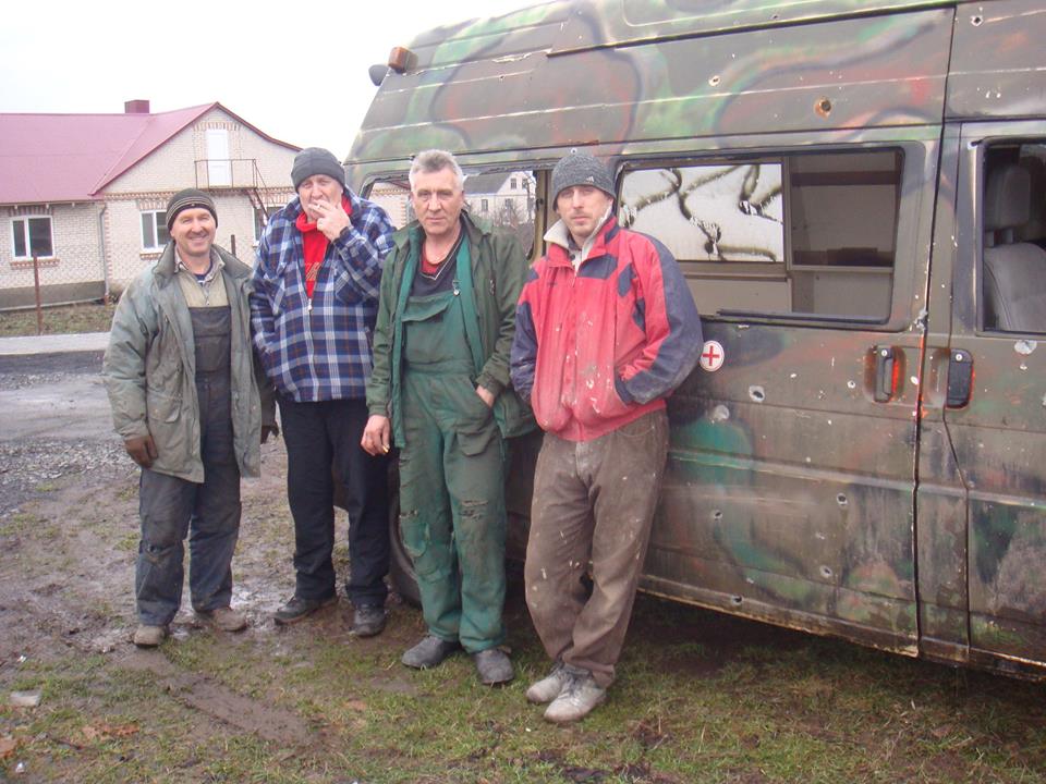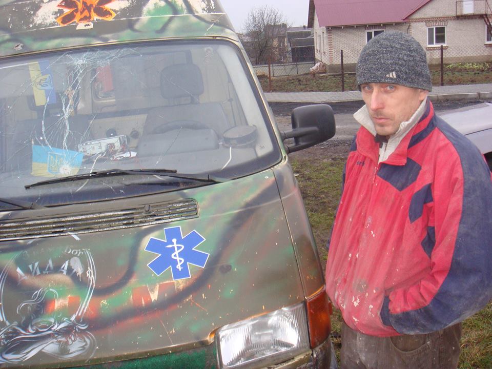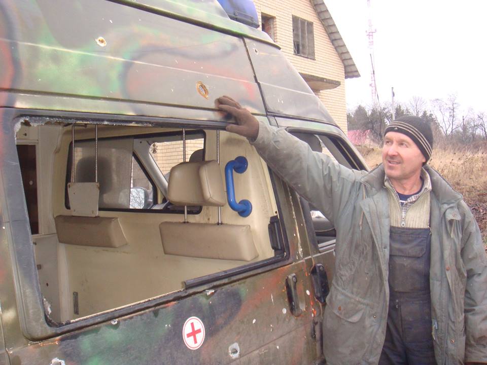 "З чергової поїздки на схід привіз з Новолуганська обстріляну градами машину швидкої допомоги. На цій машині служить наш земляк з Луцька ще з Добробату "Айдар" Дядя Коля. Він дуже просив цю машину відремонтувати, бо вона потрібна в зоні бойових дій.