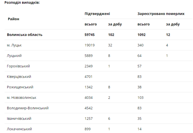 За останню добу на Волині зареєстровано 102 нових підтверджених випадки коронавірусної хвороби COVID-19 (з них дітей – 7). Одужало за добу – 149 осіб, летальних випадків – 12.