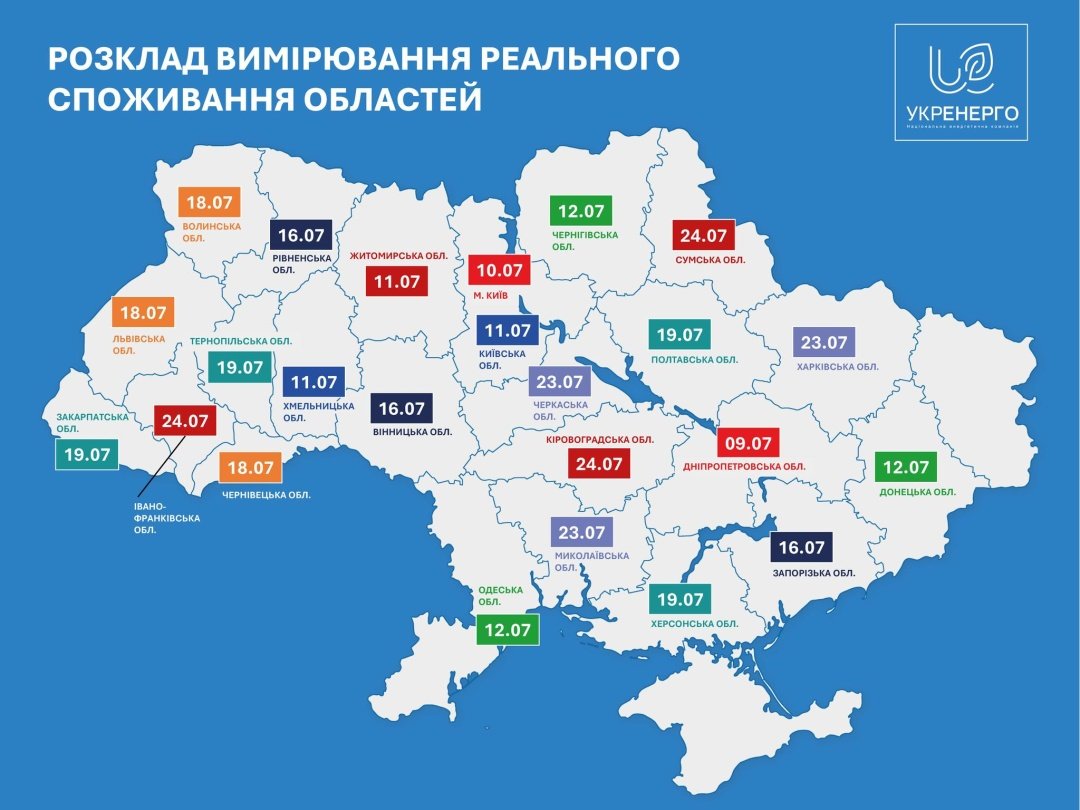 Із 9 по 24 липня проводитимуться заміри фактичного споживання електроенергії в усіх областях, через що в кожній області буде день без застосування графіків відключень.