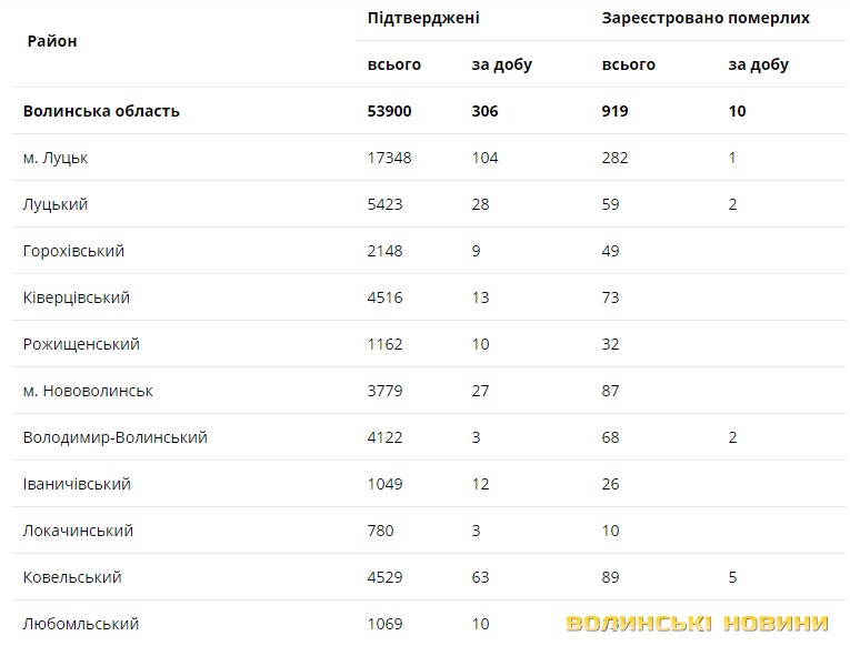 На Волині – 306 нових хворих на коронавірус, 10 людей померли. Де саме