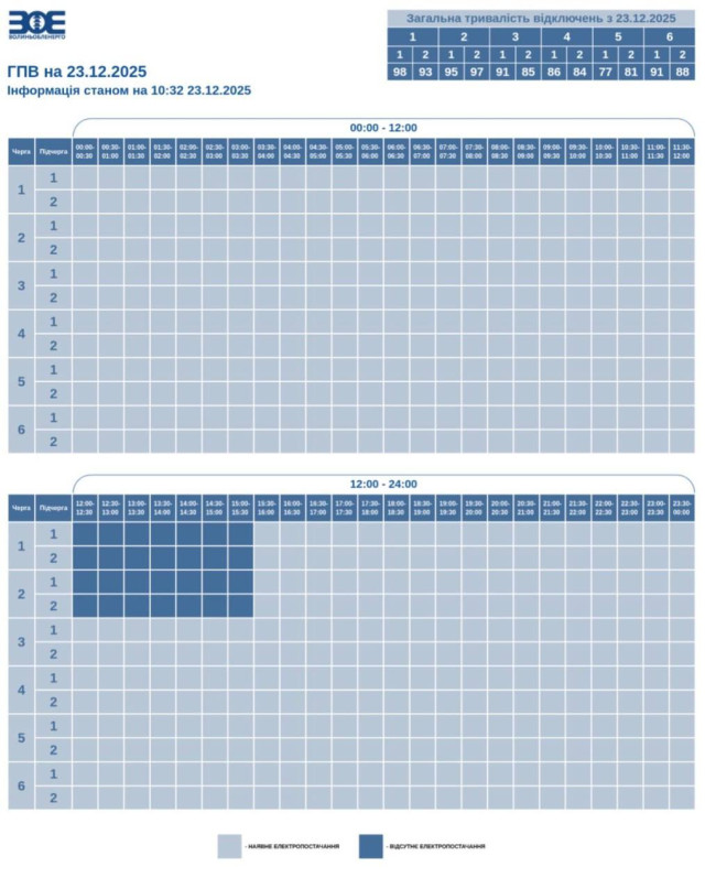 Згідно розпорядження НЕК «Укренерго», на території Волинської області введені екстрені графіки аварійних відключень з 10:03 23.12.2025.