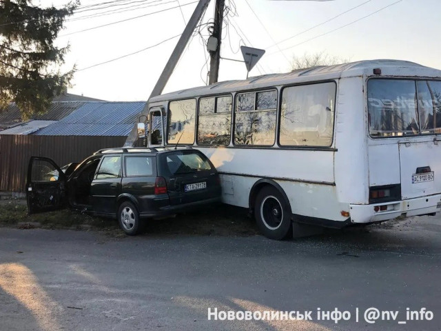 На Волині автобус, в якого врізався Opel, влетів у паркан. Фото