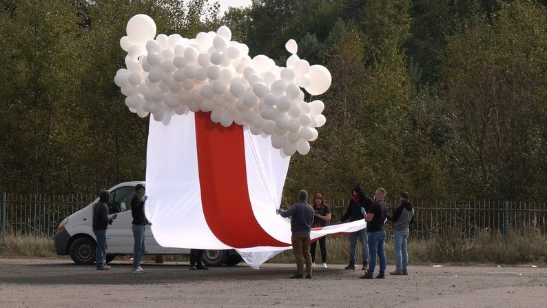 Прапор розміром десять на п’ять метрів підняли у повітря з допомогою повітряних кульок. Як і планували учасники акції, стяг полетів у бік Білорусі.