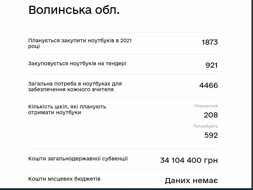 Як йдеться в інформації Міністерства освіти, загальна потреба в ноутбуках для забезпечення кожного вчителя на Волині – 4 466 одиниць техніки для 592 шкіл. За кошти субвенції планують придбати цього року 1 873 комп’ютери. Планується, що вони надійдуть у 208 шкіл області.До слова, перший тендер на придбання 921 ноутбука вже оголошений: сума закупівлі 18,5 мільйона гривень.