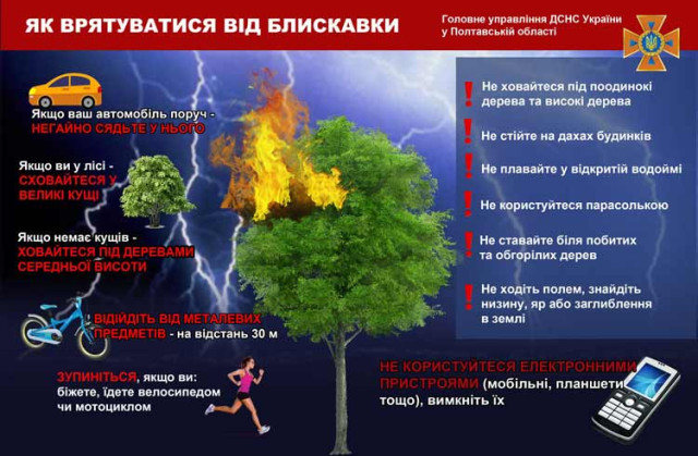 Рятувальники попереджають! Блискавка небезпечна тоді, коли за спалахом тут же лунає гуркіт грому, тобто грозова хмара знаходиться над вами і небезпека удару блискавки найбільш вірогідна. Перш за все під час наближення грози краще утриматися від поїздок в ліс, поле або до водоймища.