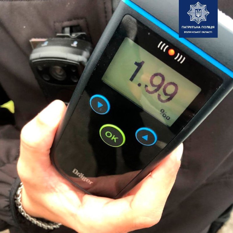 У присутності свідків чоловік пройшов огляд на стан сп’яніння. Результат – 1, 99 проміле, що майже в 10 разів перевищує допустиму норму.