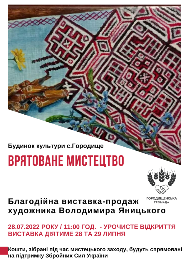 Мистецький захід є благодійним і діятиме протягом двох днів – 28 та 29 липня у будинку культури с. Городище.