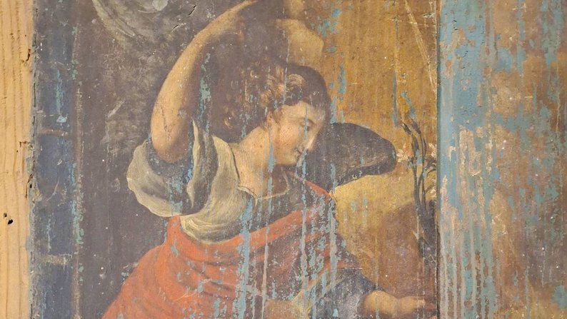 Як розповів дослідник, на одній стороні зображений біблійний сюжет «Новозавітна Трійця», що зображує Бога-Отця, Ісуса Христа та Святого Духа, що сходить з неба. З іншого боку – «Благовіщення Пресвятої Богородиці». Історик зауважив, що у XVIII столітті більшість храмів належали Українській греко-католицькій церкві, а стилістика живопису мала проєвропейський характер.