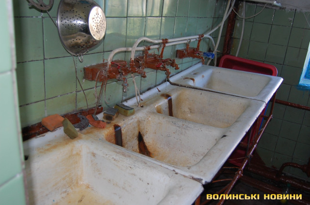 Довгі сяк-так збиті столи і лавки в пилюці, на підлозі – коричневі плями жиру та намертво всохлі в плитку залишки їжі. У підсобному приміщенні – іржаві умивальники, на яких лежить брудне ганчір’я. На плитах у кухні – бруд, рештки їжі та жир. За день до початку навчання їдальня зовсім не готова приймати школярів.