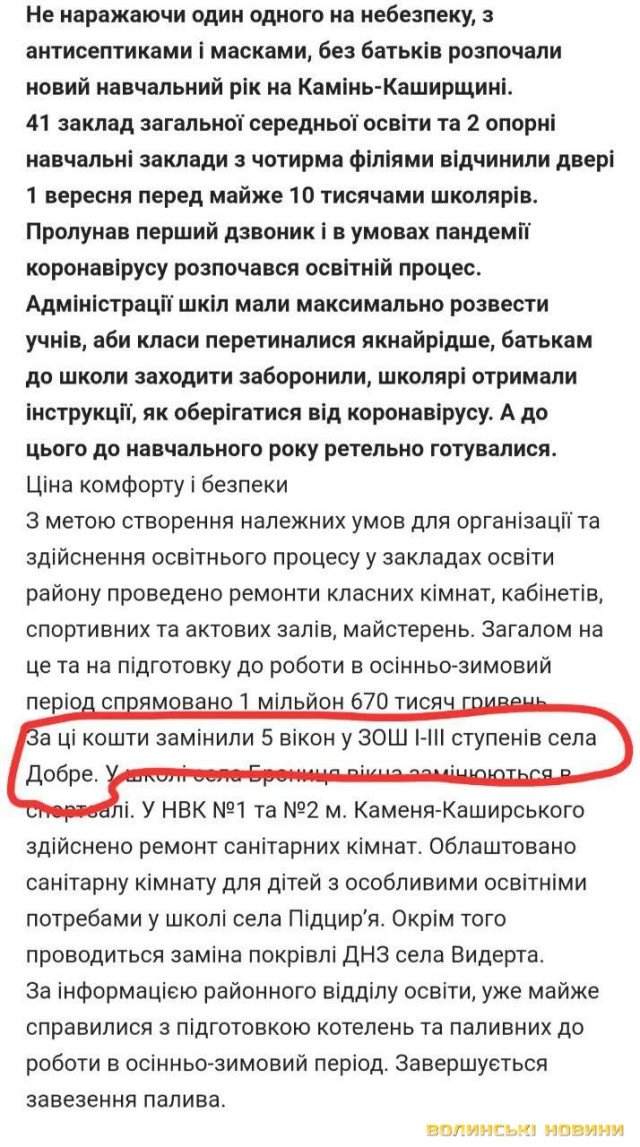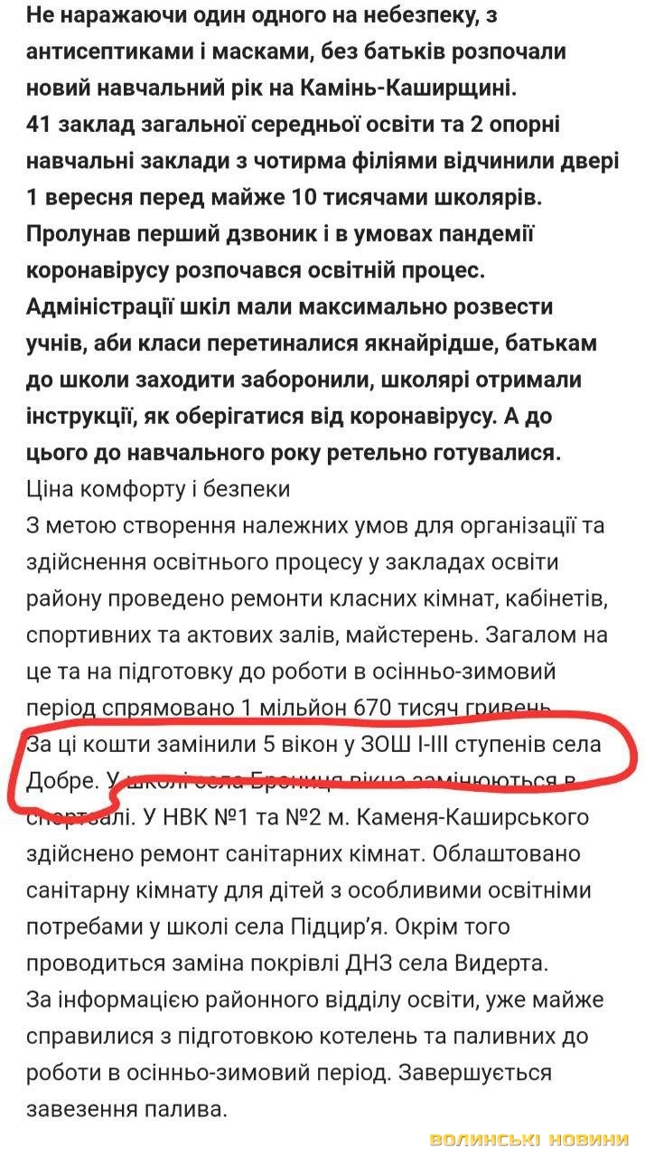 «Річ у тім, що у березні 2020 року ми власним коштом придбали для школи п’ять нових вікон. Натомість Віктор Іванович привласнив собі цю заслугу, давши коментар кореспондентці газети «Полісся», у якому розповів, що, мовляв, заміну вікон у навчальному закладі провели за кошти бюджету. А тим часом, батьківський і навіть педагогічний колектив самотужки зібрав 12 тисяч 800 гривень, аби нашим дітям було тепло і затишно у приміщенні, якому вже 90 років. Як доказ – чеки, які, на щастя, ми зберегли. Необхідну суму збирали поетапно, оскільки окремими батькам було дуже сутужно виділити з сімейного бюджету необхідну суму», – розповідає багатодітна мама Галини Пась, яка, за іронією долі, носить однакове прізвище із кандидатом в депутати, дії та вислови якого так обурили батьківський колектив.І справді, переглядаючи статтю, опубліковану 3 вересня 2020 року, в якій Віктор Пась дав коментар журналістам видання «Полісся», не можна не зауважити наступне: