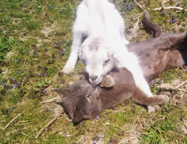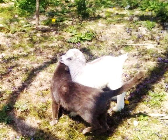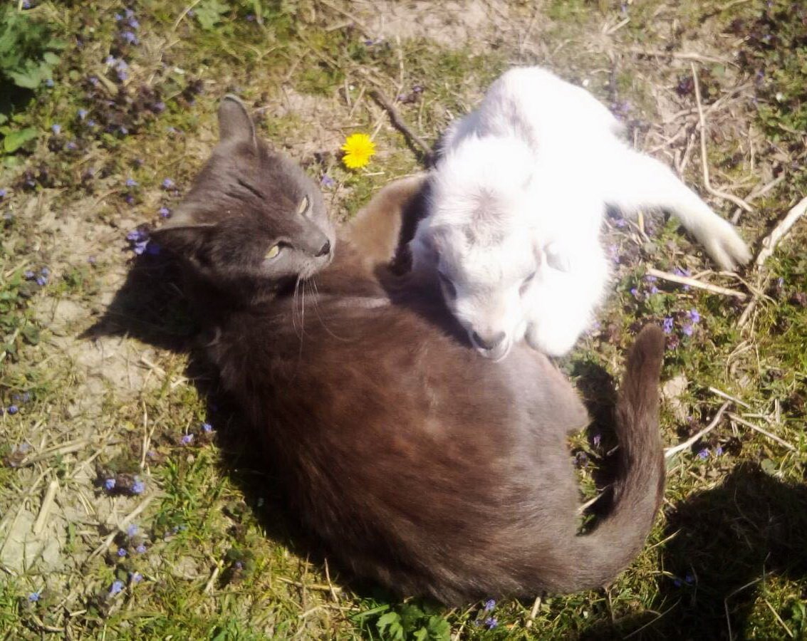 Раптом Шеба зірвалася з місця та кинулася до новонароджених і почала вилизувати козенят. Два дні вона не виходила з хліва. Їй туди і їсти носили. Мамі-козі дозволялось лише годувати дітей. А далі за справу бралась прийомна мама-кішка.