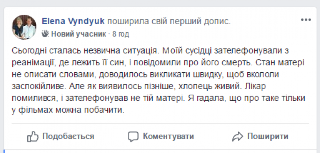 Але як виявилось пізніше, хлопець живий. Лікар помилився, і зателефонував не тій матері. Я гадала, що про таке тільки у фільмах можна побачити», – написала вона у дописі.