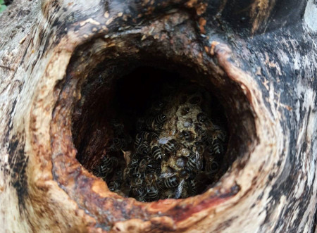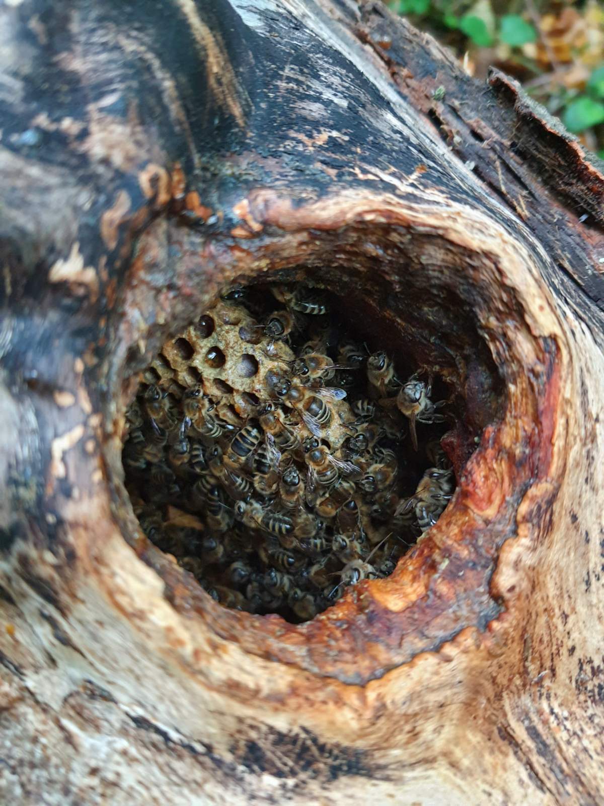 При здійсненні обстеження території Ківерцівського національного природного парку «Цуманська пуща» майстер з охорони природи відділу збереження та відтворення природних екосистем Володимир Лойко виявив повалене вітром дерево осики, де, підійшовши ближче, побачив дупло, а в ньому сім’ю диких бджіл.