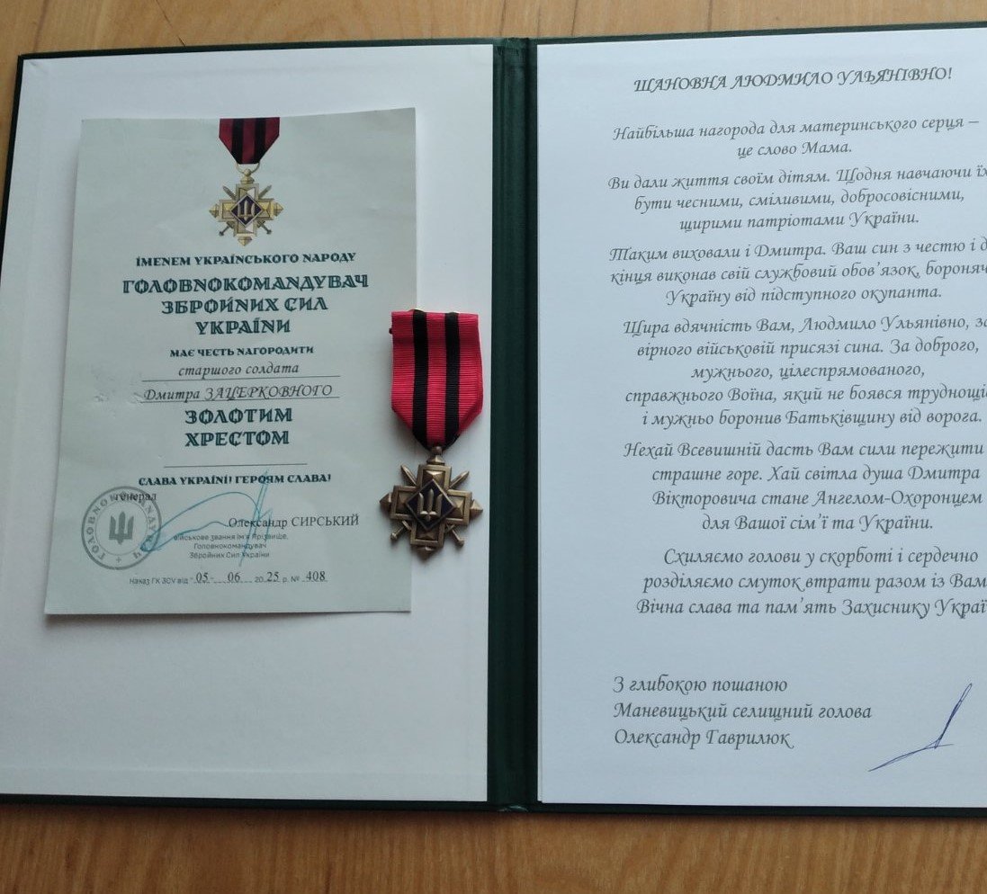 У селі Колодії мамі загиблого захисника України Дмитра Зацерковного Людмилі Ульянівні передали відзнаку Головнокомандувача Збройних Сил України «Золотий хрест», на яку її син заслужив своєю службою, але отримати її за життя не встиг.