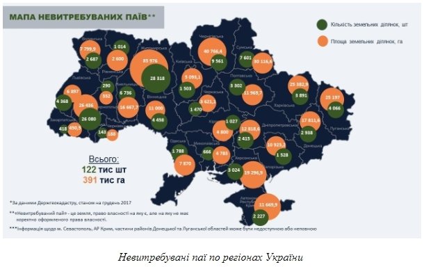 Лідерство за кількістю невитребуваних паїв належить Житомирській (28 318 шт.), Івано-Франківській (26 080 шт.), Чернігівській (9561 шт.), Хмельницькій (6736 шт.), Вінницькій (4458 шт.) областям. Найменша їх кількість – у Чернівецькій (143 шт.), Тернопільській (290 шт.), Закарпатській (418 шт.), Миколаївській (666 шт.) областях. На Волині таких паїв налічується 2687 штук.