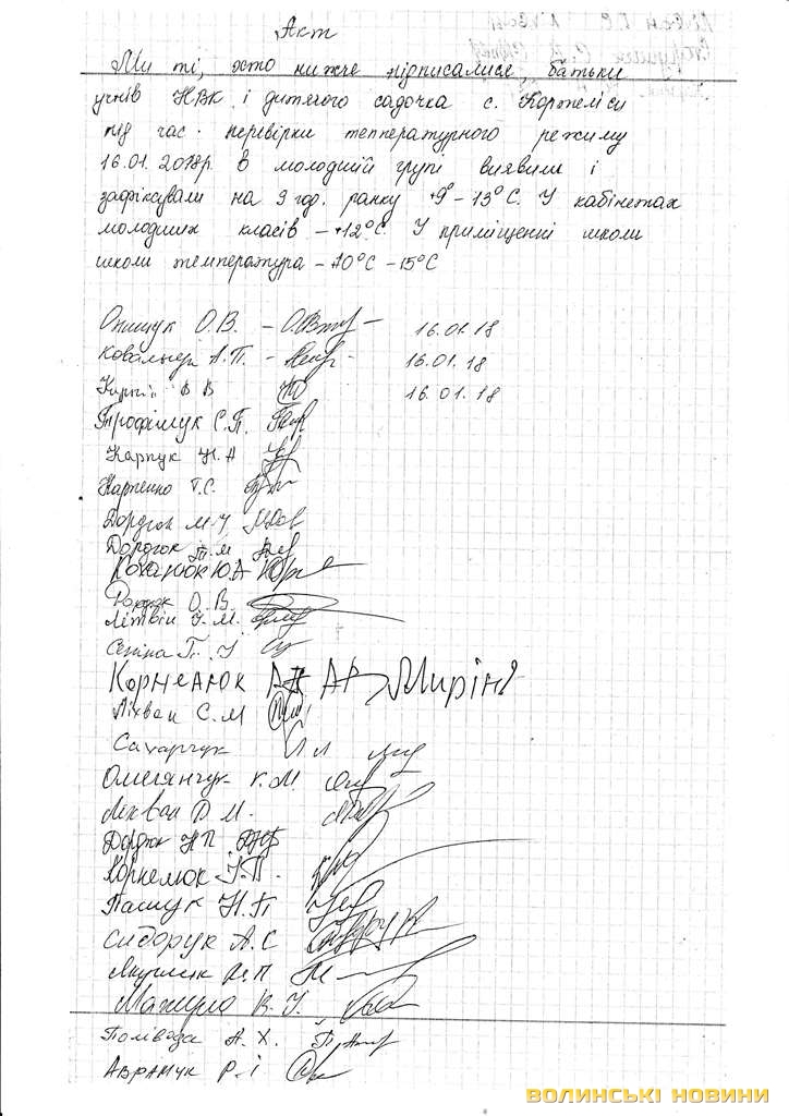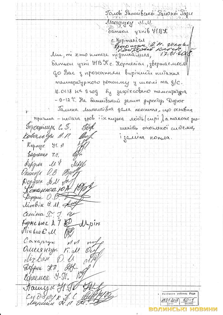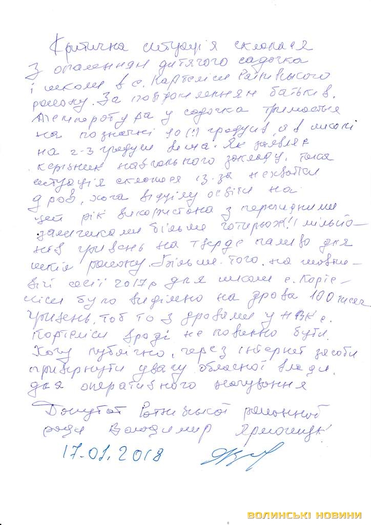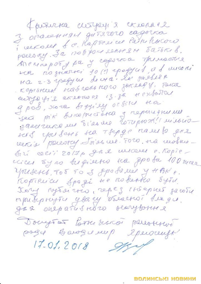 «У школі та ДНЗ виникла критична ситуація з опаленням. Як повідомляють батьки, що температура в приміщенні опустилася до 10 градусів за Цельсієм. Адміністрація школи каже, що немає дров. Зауважу, що для того, аби подібна ситуація не виникала, у районній раді ще торік виділилина це гроші, тож проблем таких не мало би бути», - наголошує депутат.Із відповідним звернення Володимир Ярмошук звернувся і в райдержадміністрацію. Але там отримав лише відписку, мовляв, більшість коштів на придбання твердого палива використали.Відреагувати на проблему просять і районну владу, зокрема батьки склали акт щодо неналежного температурного режиму та надіслали лист голові Михайлу Макаруку.У коментарі голова райради пояснив, що станом на сьогодні, 17 січня, ситуацію вдалося стабілізувати.