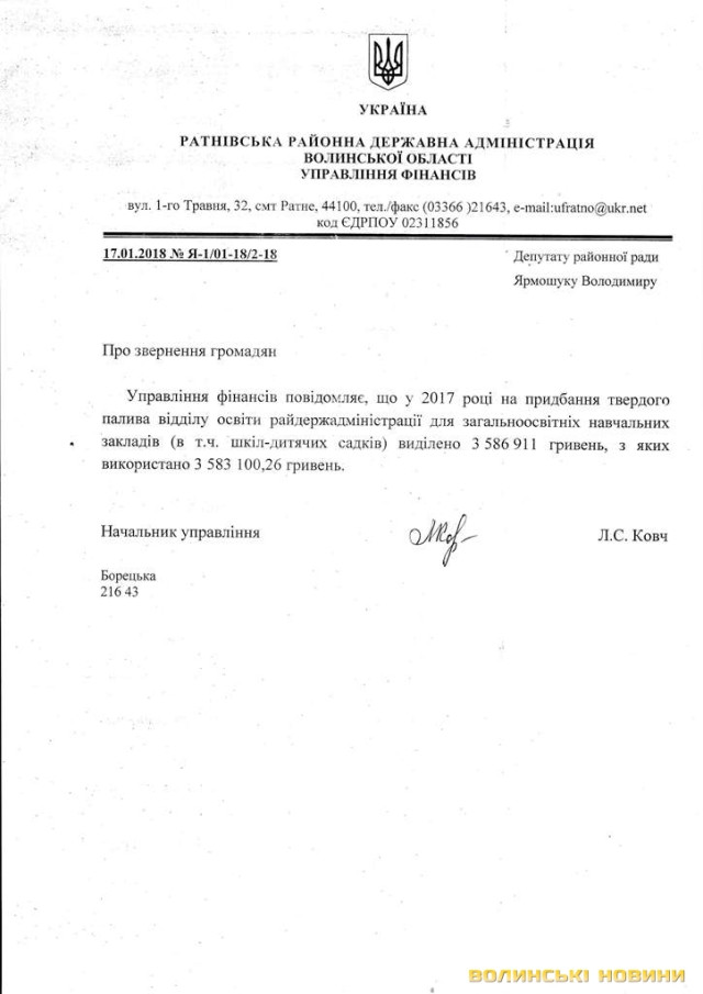 Як виявилося, відділ освіти при районній адміністрації кошти використав у повній мірі, але усі дрова не доставили, не вистачало 55 кубометрів. На 16.01 дров не було в освітньому закладі, я був на місці та інспектував ситуацію. Вже сьогодні довезли 26 кубів. В адміністрації обіцяють, що інші дрова будуть вже до кінця тижня. Ситуацію ми вирівняли», - запевняє посадовець.