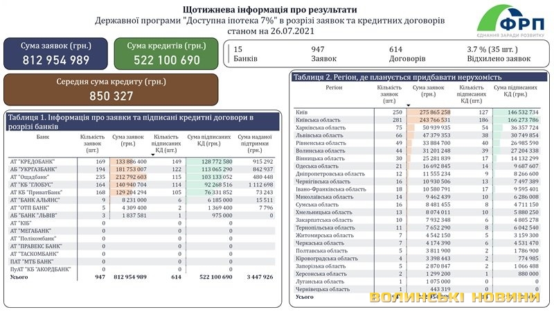 Станом на 26 липня на Волині в рамках програми «Доступна іпотека 7%» укладено 39 кредитних договорів на загальну суму 27,2 мільйона гривень. За кількістю заявок та укладених договорів Волинська область на шостому місці серед регіонів, де найактивніше купують житло в кредит за державною програмою.