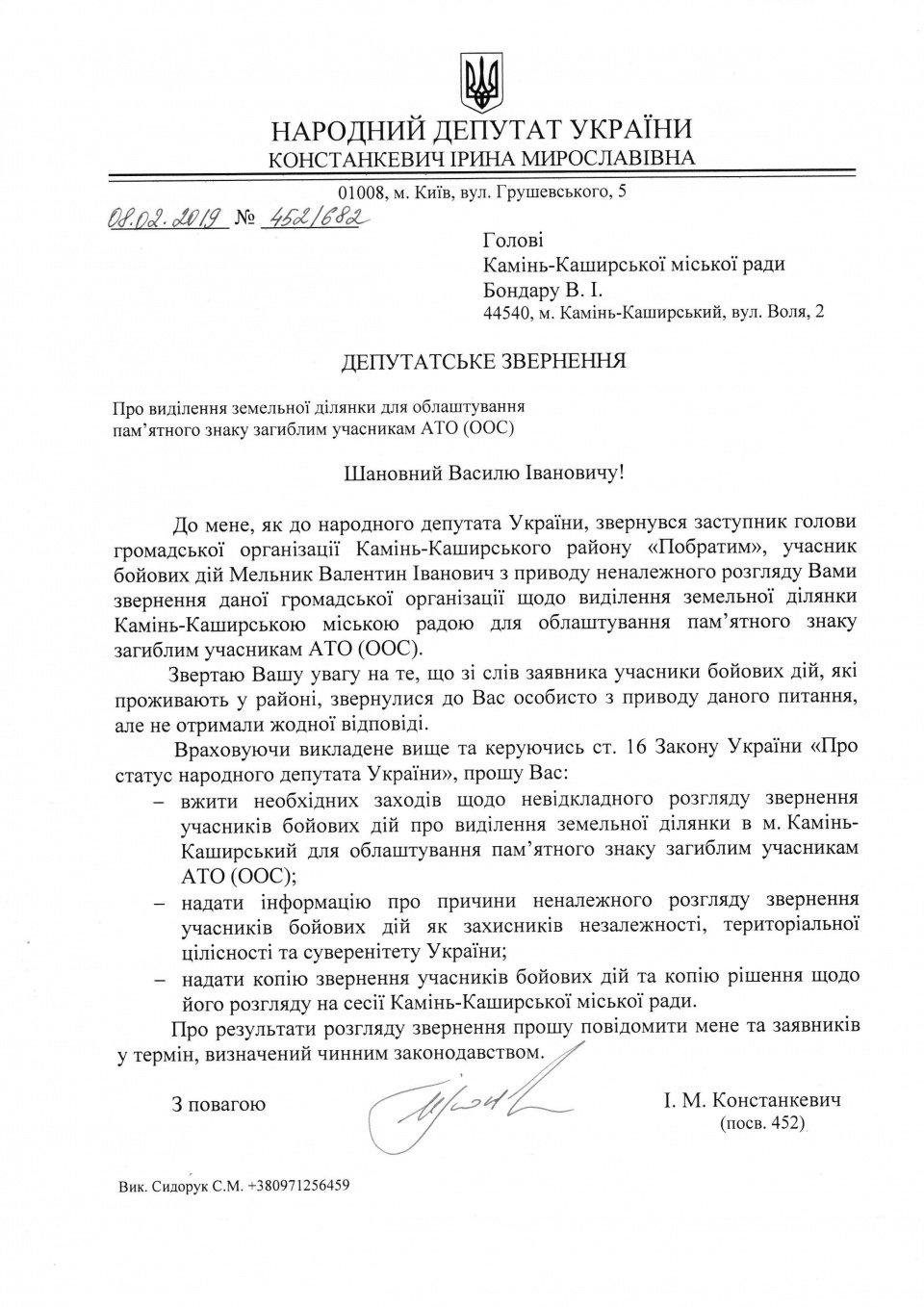 Під час нещодавнього візиту народного депутата Ірини Констанкевич звернувся заступник голови громадської організації Камінь-Каширського району «Побратим» учасник бойових дій Валентин Мельник з проханням посприяти у виділення землі для пам’ятного знаку учасникам АТО. Чоловік нарікає, що вже кілька разів зверталися до міської влади, однак місця для встановлення так і не знайшлося.Це неабияк обурило Ірину Констанкевич, вона відразу ж спрямувала відповідний депутатський запит на адресу місцевих владців та пообіцяла тримати це питання на особистому контролі.