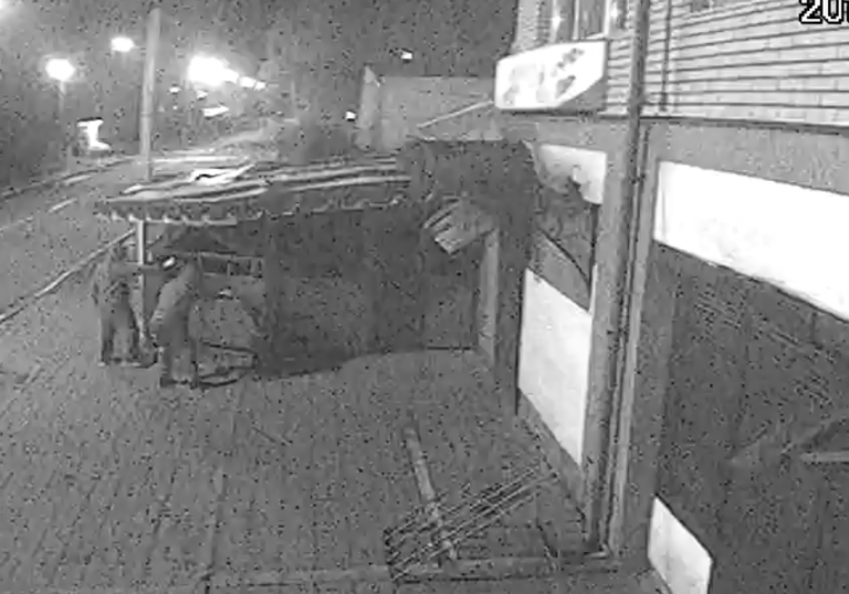 На відео видно, як двоє чоловіків підбігли до кафе, облили альтанку невідомою легкозаймистою речовиною та підпалили. Після цього вони покинули місце події.