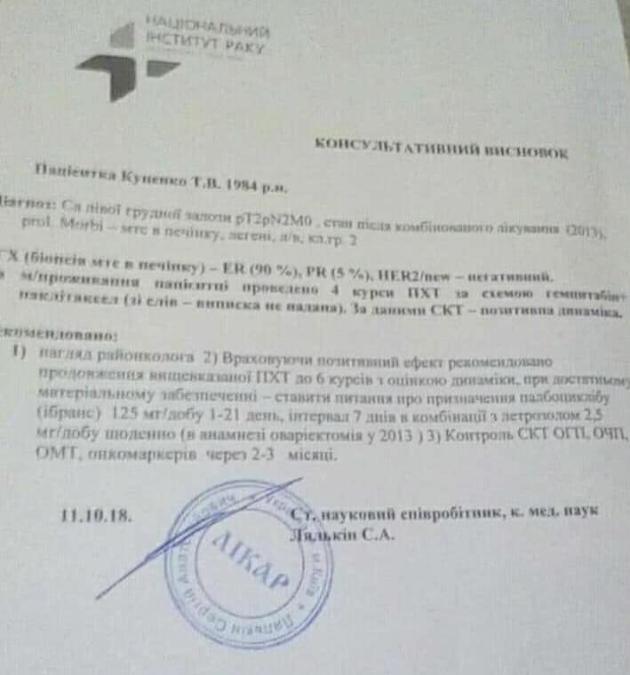 «Відписка одна - купуйте за свої кошти. Донька прийняла вже декілька курсів. Покращилось самопочуття, почала вставати і виходити на вулицю, припинились фізичні муки. А головне – зменшуються метастази. В легенях нема, а в печінці зменшилися на половину», – поділилась Людмила Цимбалюк.