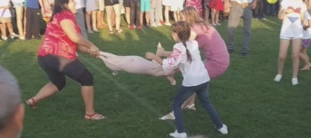 На сільському стадіоні в селі Забороль організатори влаштували конкурс. Люди накинулися на двох поросят і почали тягнути їх у різні сторони.