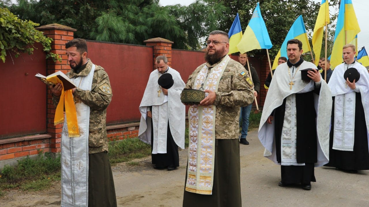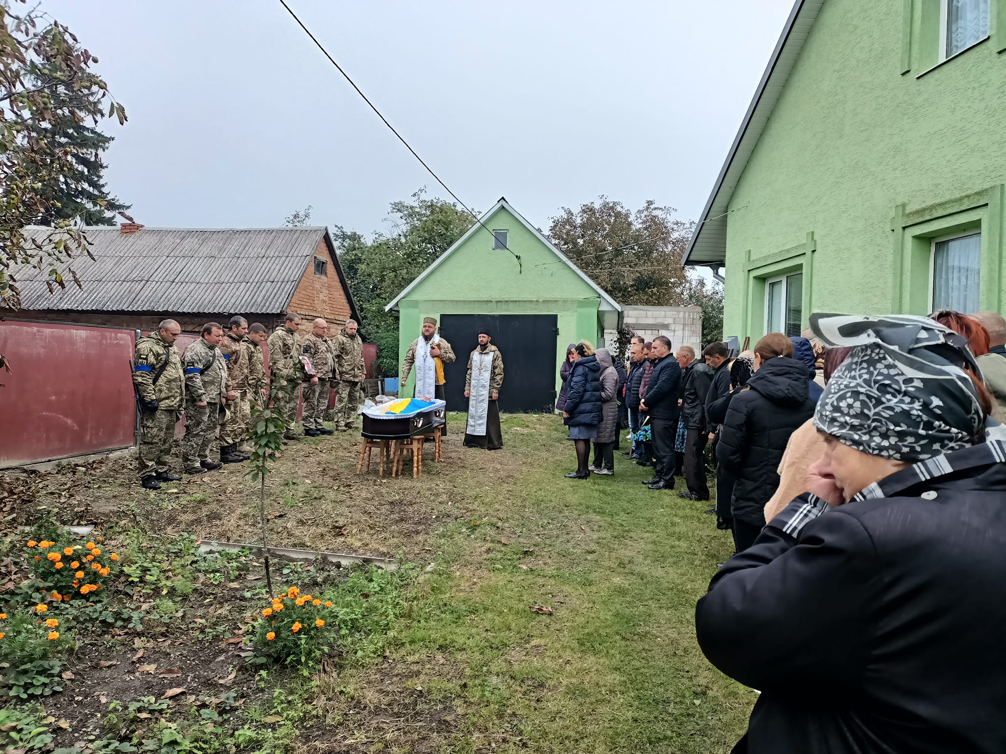 На подвір’ї батьківської хати священнослужителі, родина, місцеві мешканці, побратими та представники місцевої влади розпочали спільну молитву за душу загиблого воїна.