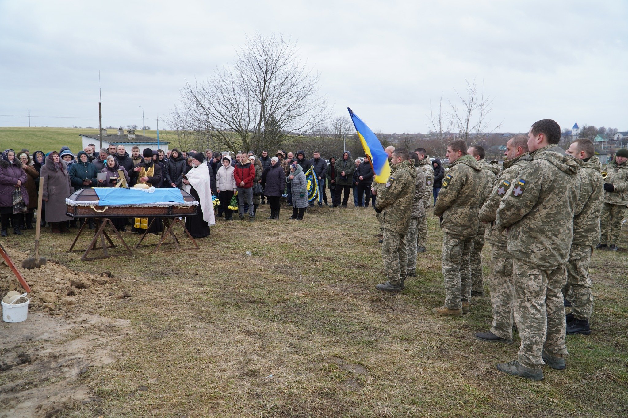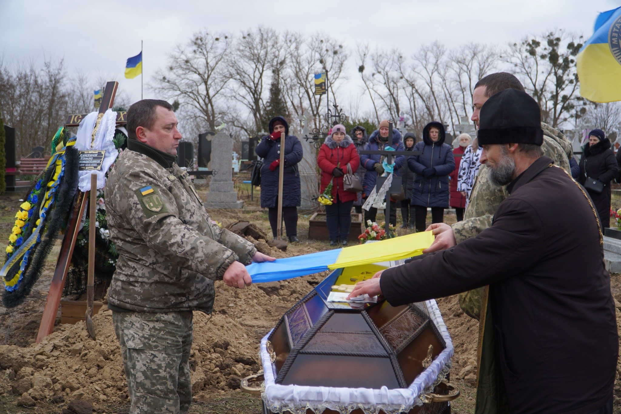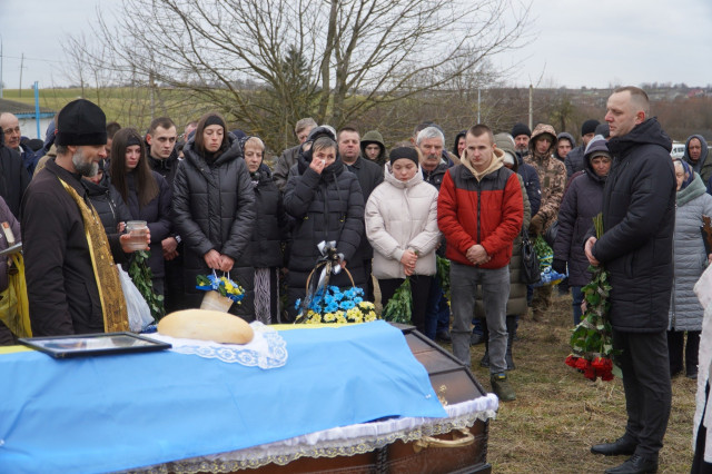 На цвинтар рідного села, де вже чимало могил з українськими прапорами, зійшлись цього холодного дня численні односельці, друзі та колеги воїна, його побратими. Військовий оркестр заграв бійцю останню мелодію.