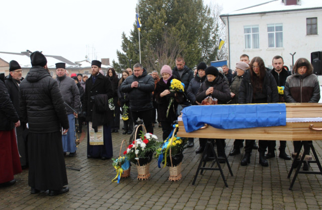 Після прощання на рідному обійсті траурний кортеж рушив у центр міста, де біля пам’ятного знака Борцям за волю та незалежність України відбулася громадська панахида.