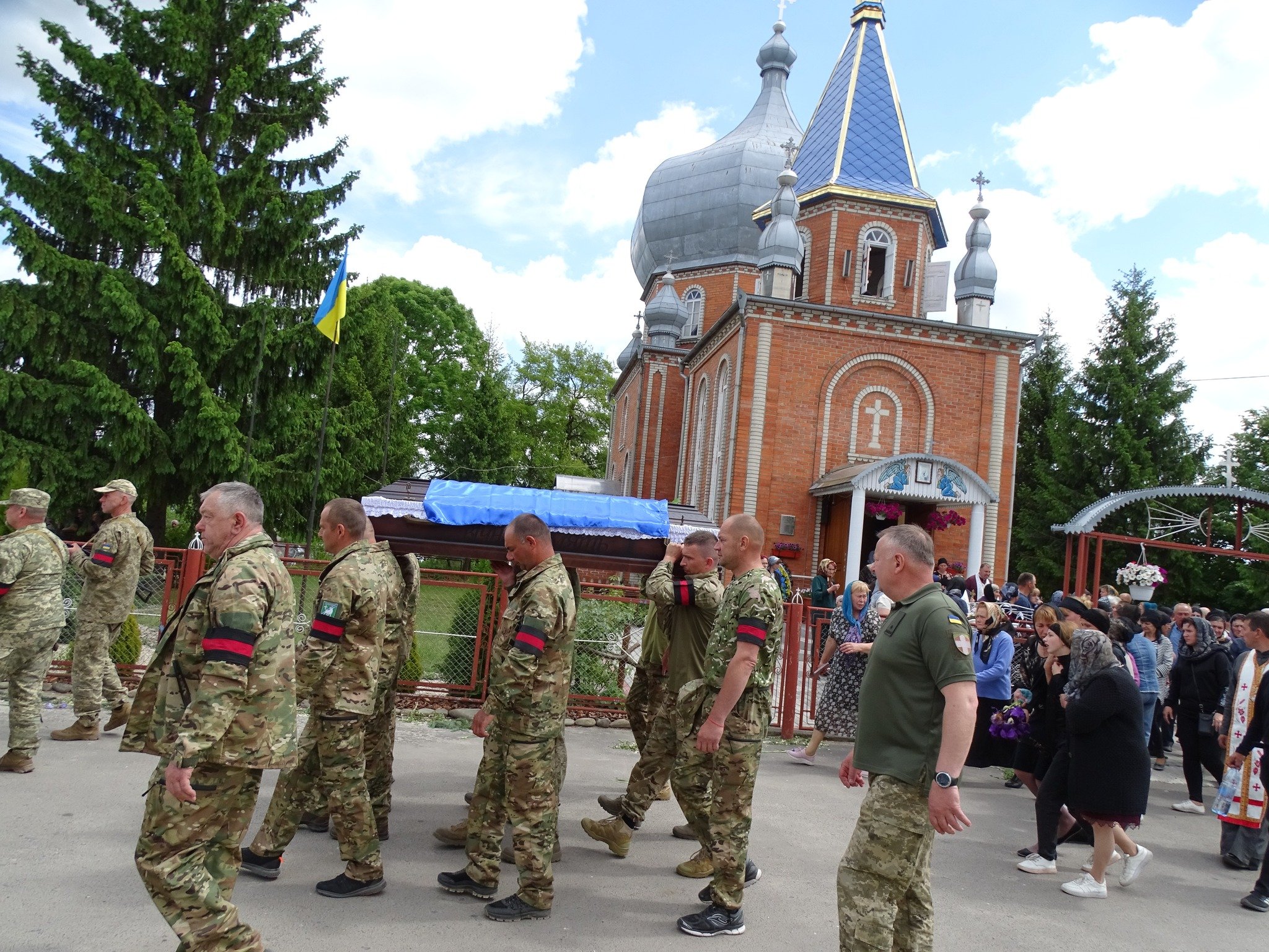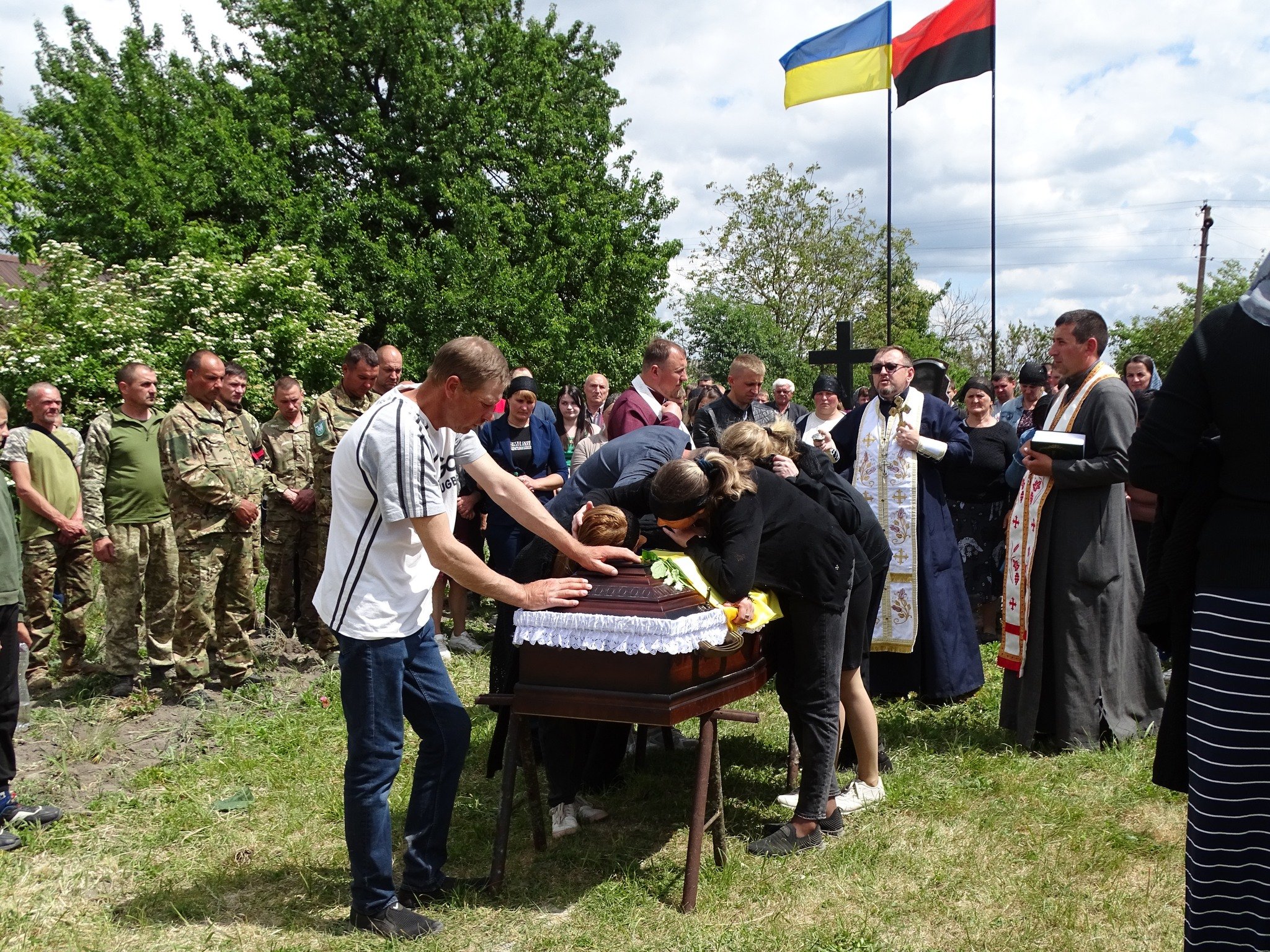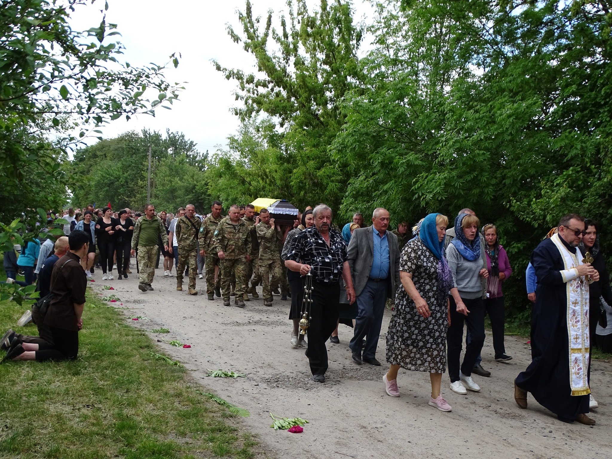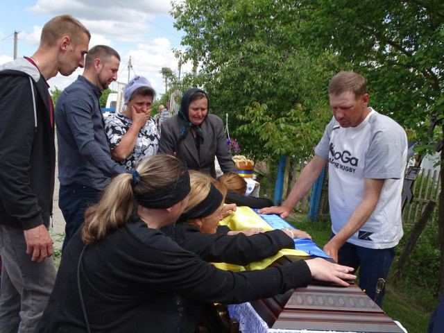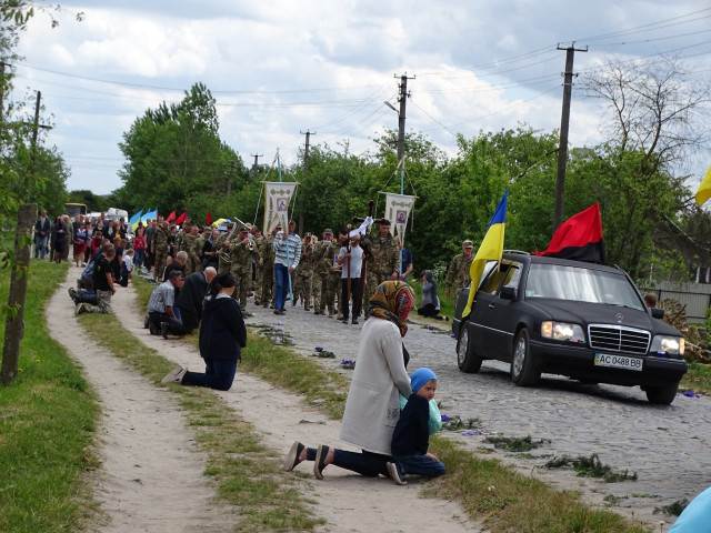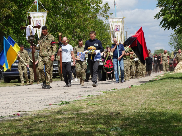 Віддаючи данину шану, люди на колінах зустрічали загиблого захисника. По уквітчаних піонами, ірисами та травневим різнотрав’ям дорогах Героя на плечах пронесли вулицями села до місця земного спочинку на місцевому кладовищі.