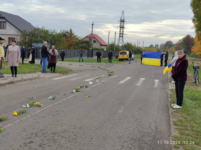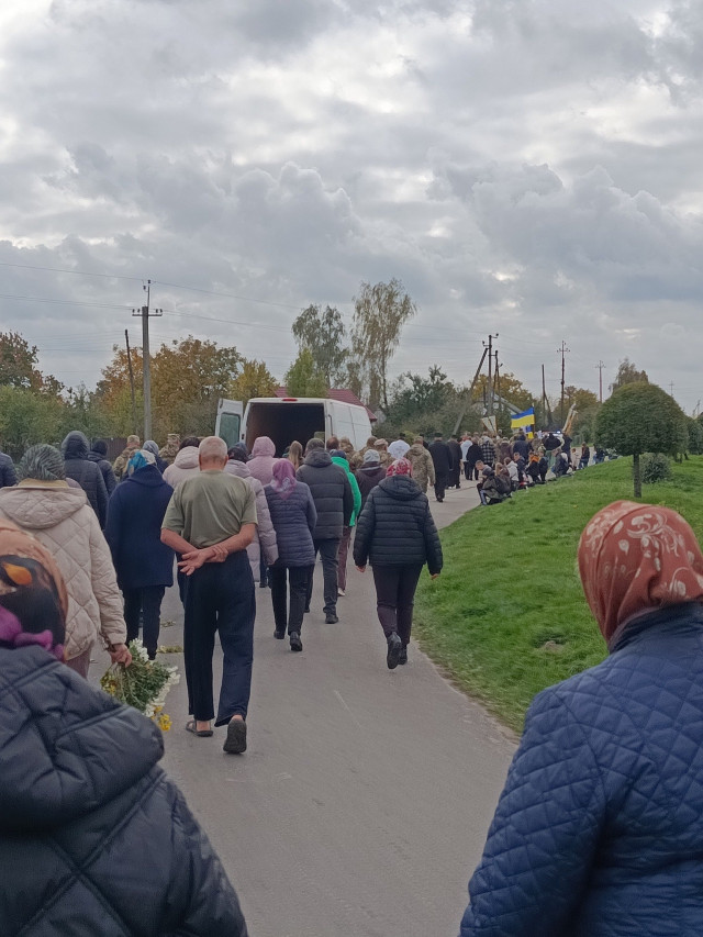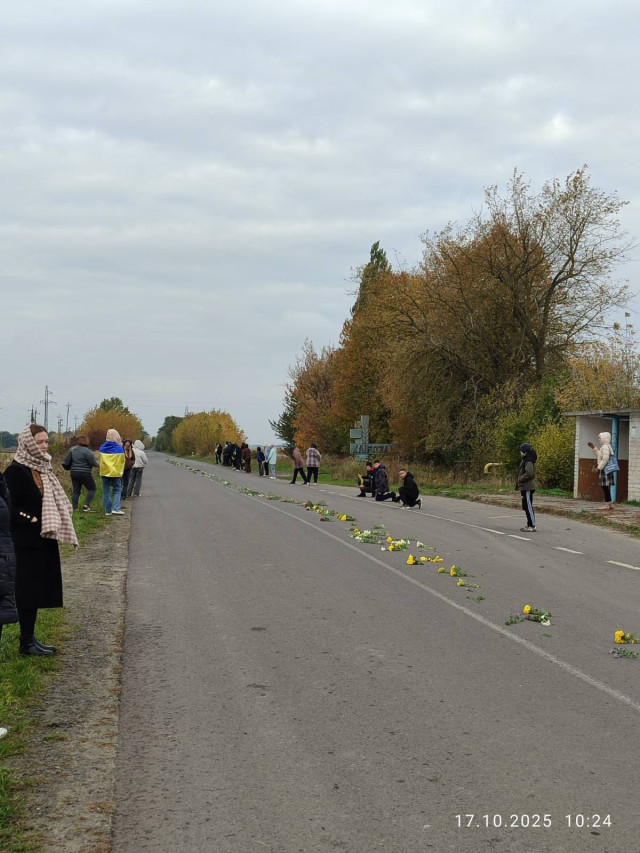 Остання земна дорога Захисника була встелена живими квітами. Уздовж дороги стояли жителі громади – на колінах, із прапорами у руках, віддаючи шану полеглому Герою.