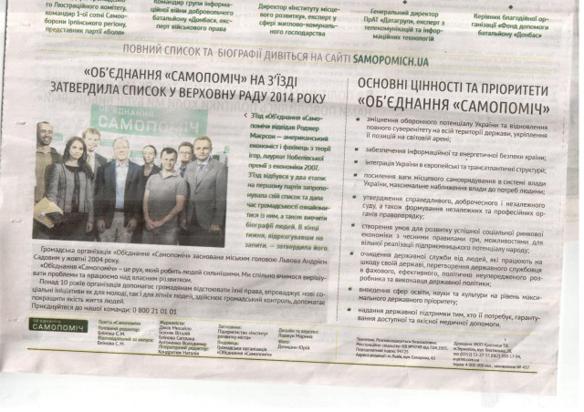 Наприклад, в поштових скриньках багатоповерхових будинків в спальних районах Луцька на початку жовтня розповсюджувалися газети з агітацією за Об’єднання «Самопоміч». В газеті міститься інформація про те, що партія бере участь у виборах та вказані кандидати в депутати з першої десятки виборчого списку. Видавцем цієї газети значиться ГО «Об’єднання «Самопоміч». І хоча датою виходу газети вказано 21 вересня, а партія зареєстрована в ЦВК лише 25 вересня, однак, розповсюджували цю поліграфію вже в перших числах жовтня.