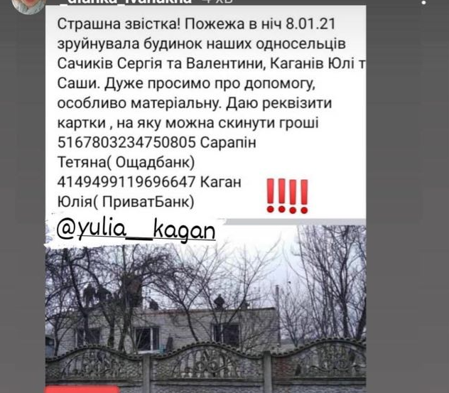 Як зазначають, вночі, 8 січня, пожежа зруйнувала будинок волинян Сачиків Сергія та Валентини, Каганів Юлії та Олександра. Потерпілі просять про допомогу.
