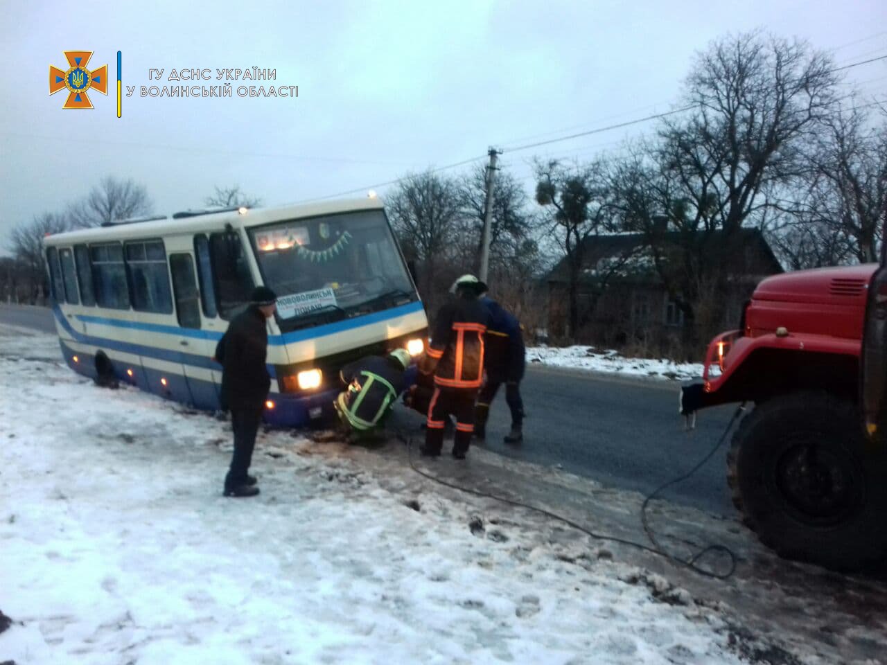 За викликом до місця події прибули рятувальники 15 Державної пожежно-рятувальної частини смт Локачі. За допомогою троса вони відбуксирували транспортні засоби на стійку ділянку автодороги.17 грудня о 8:10 у селі Крухиничі Володимир-Волинського району рейсовий автобус «Нововолинськ – Локачі» з’їхав з дороги на узбіччя, вкрите талим снігом, та не зміг продовжити рух. В автобусі перебували водій та 20 пасажирів. Рятувальники 15 Державної пожежно-рятувальної частини смт Локачі, які прибули на допомогу, відбуксирували транспортний засіб на стійку ділянку автодороги, після чого той продовжив рух за маршрутом.