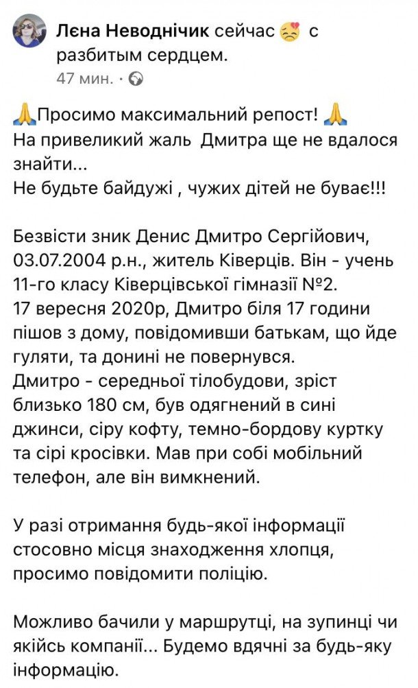 17 вересня, Дмитро біля 17 години пішов з дому, повідомивши батькам, що йде гуляти та донині не повернувся.