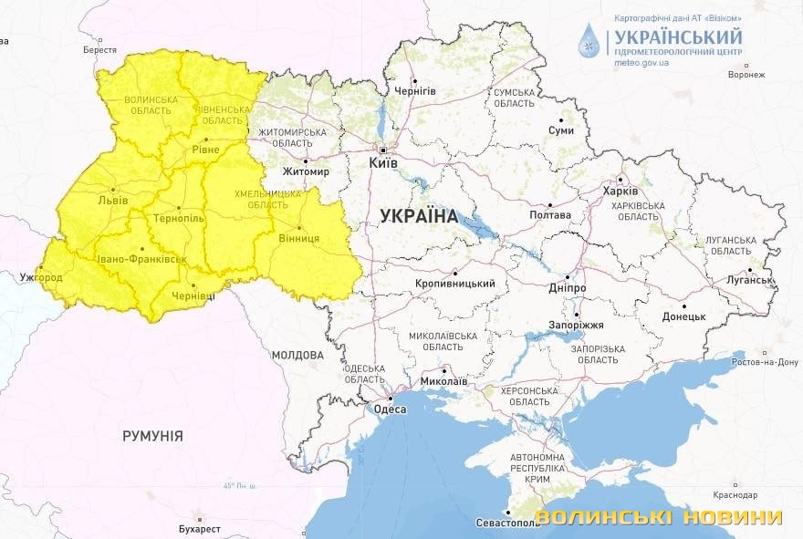 Загалом у західних та Вінницькій областях грози, в окремих районах град та шквали 15-20 м/с, на Закарпатті та Прикарпатті значні дощі (I рівень небезпечності, жовтий).