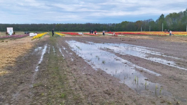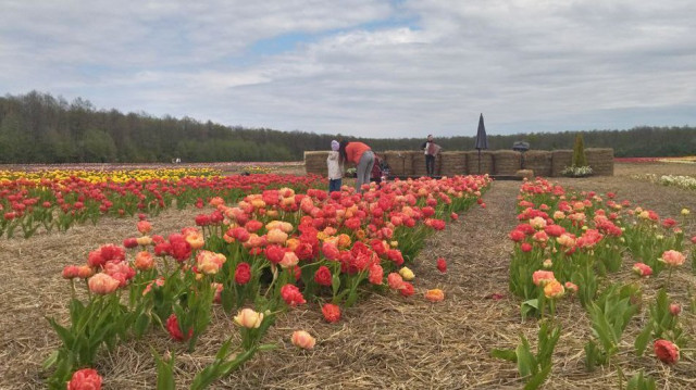 Один рядок – це орієнтовно 15 тисяч цибулин.«Цьогоріч в нас з десяток новеньких сортів. Особливо пишаємося червоним піоновидним. Назва його Бомбастік Ред. Велика квіточка. Він дуже високий, потужний. Відвідувачі просто в захваті від цього сорту», – каже Тетяна Пашковська.Зізнається: думала, що через паводок три гектари тюльпанового поля цього року розквітнуть пізніше, проте сонце й тепло наприкінці квітня допомогли розпочати фестиваль тюльпанів вчасно. Та все ж частина квітів через надмірну кількість опадів таки пропала.«Наше поле трішечки підтопило, але зараз вже все гаразд. Тюльпани все ж таки перемогли. Дуже гарно і яскраво квітнуть. Відсотків 20 не виросло. Де вода стояла, тому сорту і було погано. Уже ці цибулинки не виростуть – вони замокли», – констатує пані Тетяна.