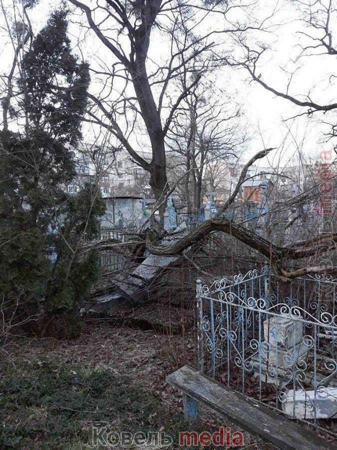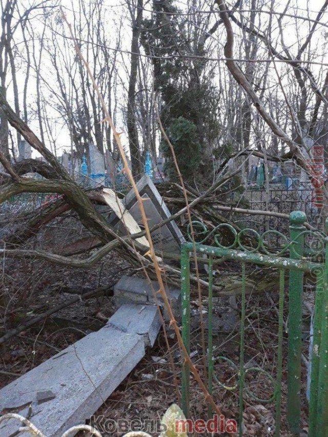 Сильні пориви вітру, про які попереджали синоптики, наробили лиха У Ковелі на кладовищі, що на вулиці Незалежності, через сильні пориви вітру повалило дерева та пам'ятники.