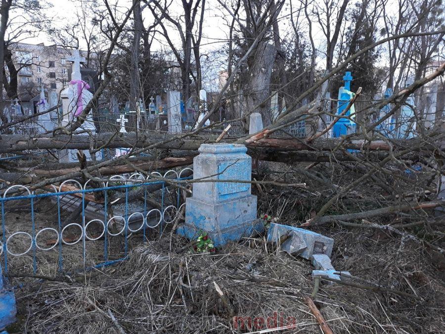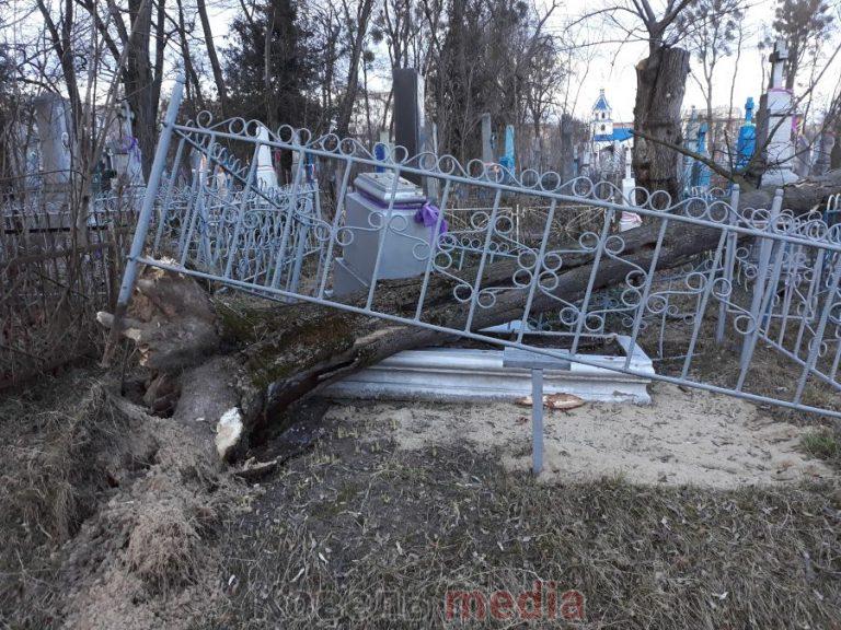 Стихія повалила кілька дерев, причому деякі – з корінням, які при падінні розбили пам’ятники. Це сталося в районі Михайлівської церкви.