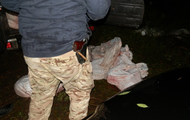 В результаті огляду автівок було виявлено 15 мішків з м’ясом. Також там була голова вбитого лося.